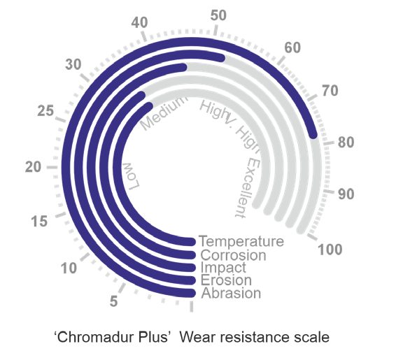 Chromadur Plus is a premium chromiumcarbide overlay wear plate designed for severe abrasive wear environments. It offers improved performance over standard chromium-carbide plates due to refined microstructure and optimized alloy composition.